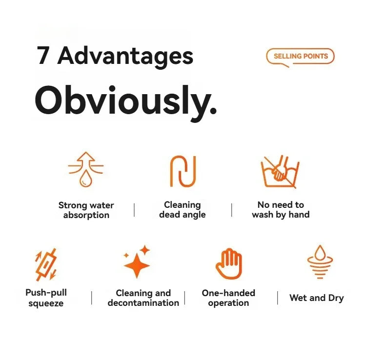 • Self-Squeeze 180° Folding Design: Push-pull ring action wrings out water quickly with one hand.