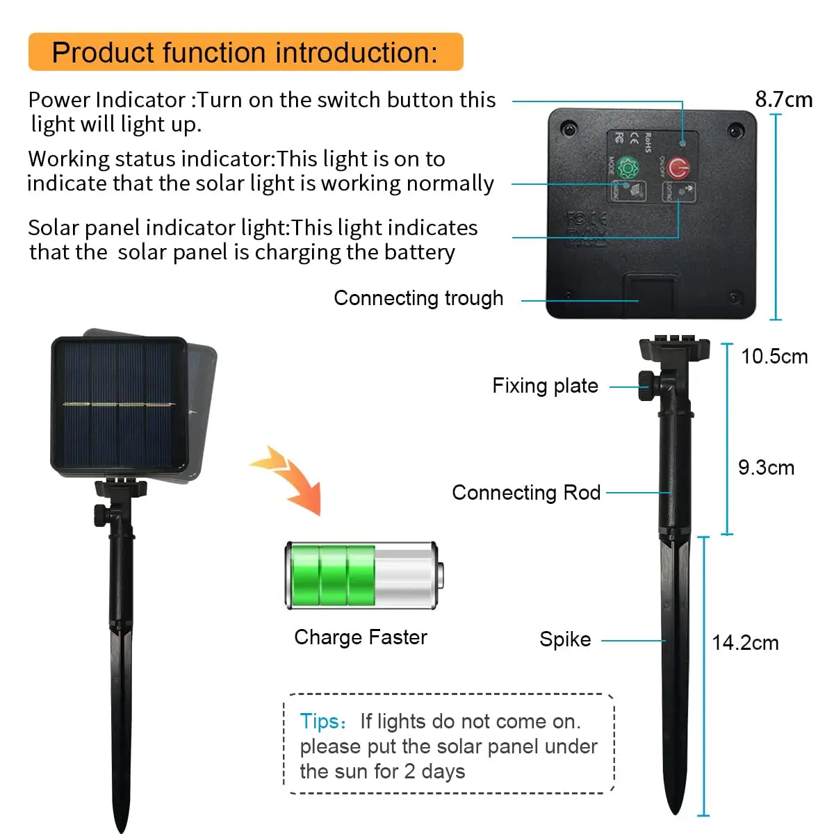 Made from durable ABS material designed for outdoor conditions. Ensure the solar panel is placed in direct sunlight for optimal charging. Clean the panel surface periodically to maintain performance. Suitable for all-weather outdoor use